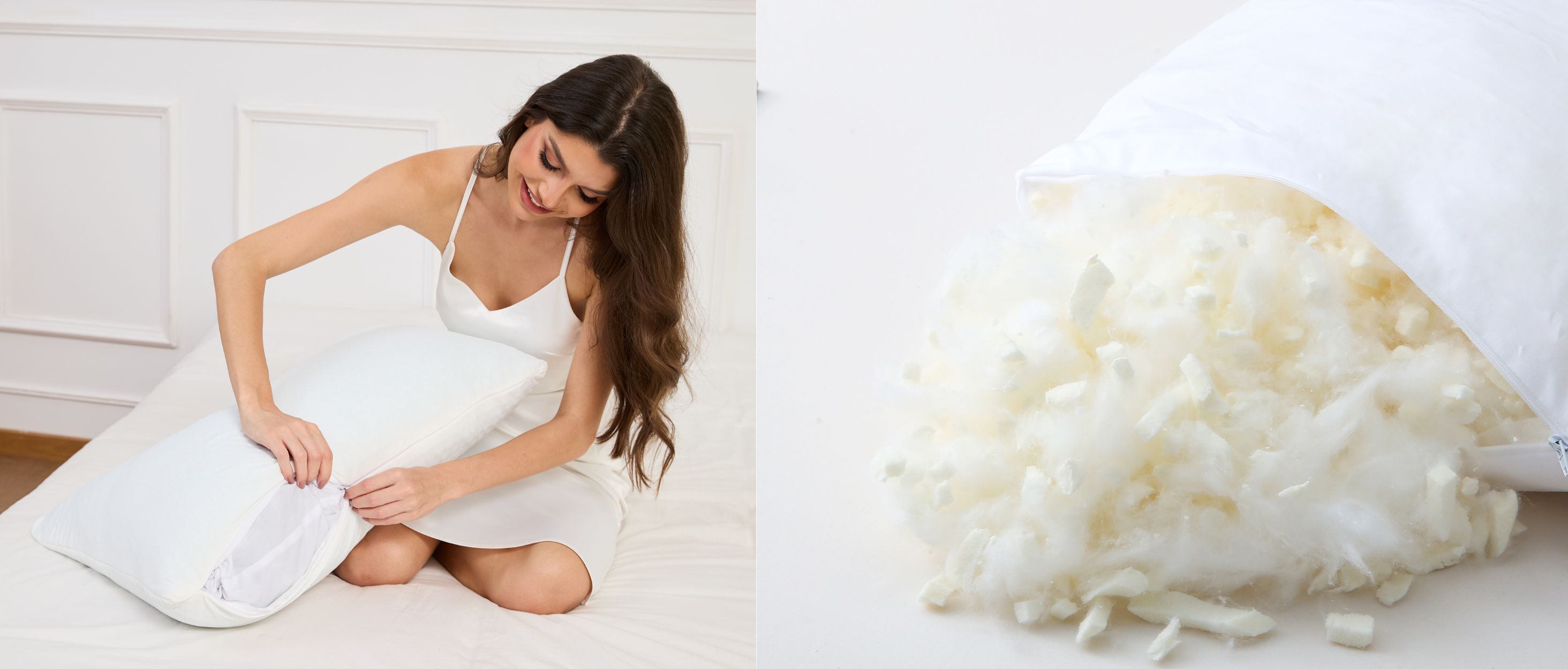The shredded latex fill is fully adjustable, allowing you to fine-tune loft and firmness for your exact sleep posture. A zippered inner chamber and included extra fill pouch make it simple to create a pillow that feels made just for you.